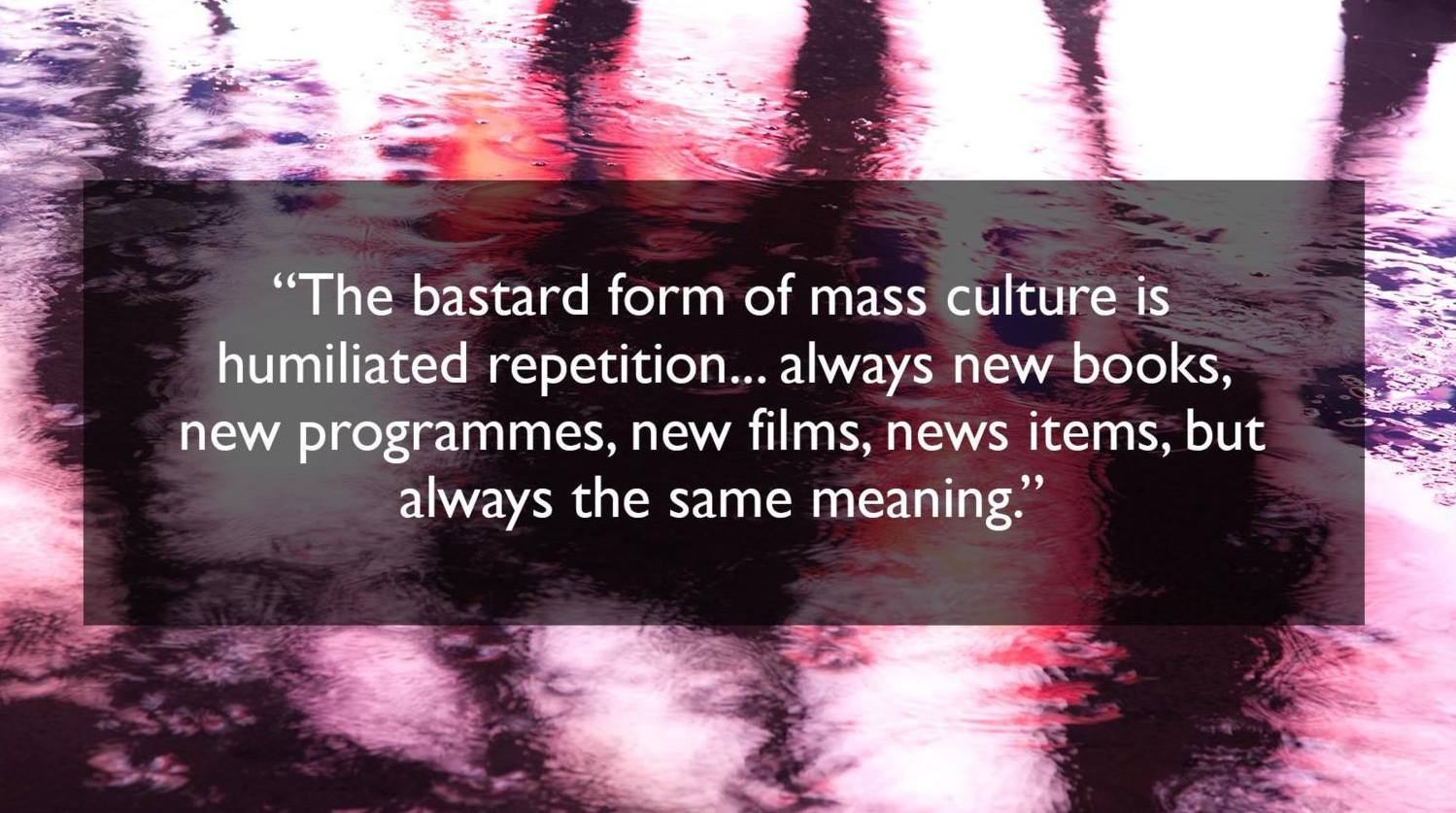“forma bastarde e masë-kulturës është përsëritja e paturpshme (poshtëruese) … përherë libra të rinj, programe të reja, filma të rinj, artikuj lajmesh, mirëpo gjithmonë i njëjti kuptim.” – Roland Barthes