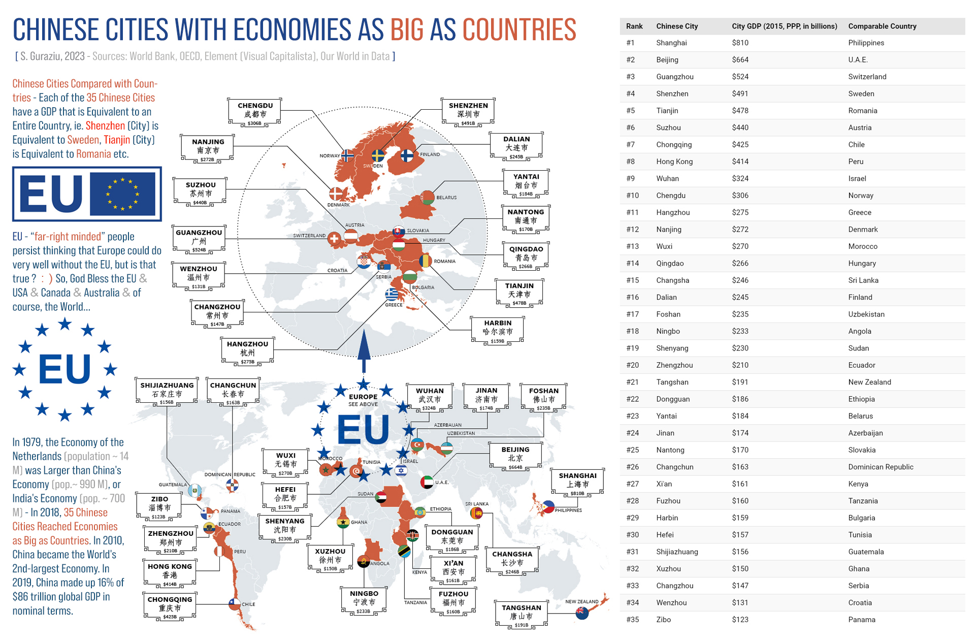 In 1979, the Economy of the Netherlands (population ~ 14 Million) was Larger than China’s Economy (population ~ 990 M), or India’s Economy (population ~ 700 M) – In 2018, 35 Chinese Cities Reached Economies as Big as Countries. In 2010, China became the World’s 2nd-largest Economy.