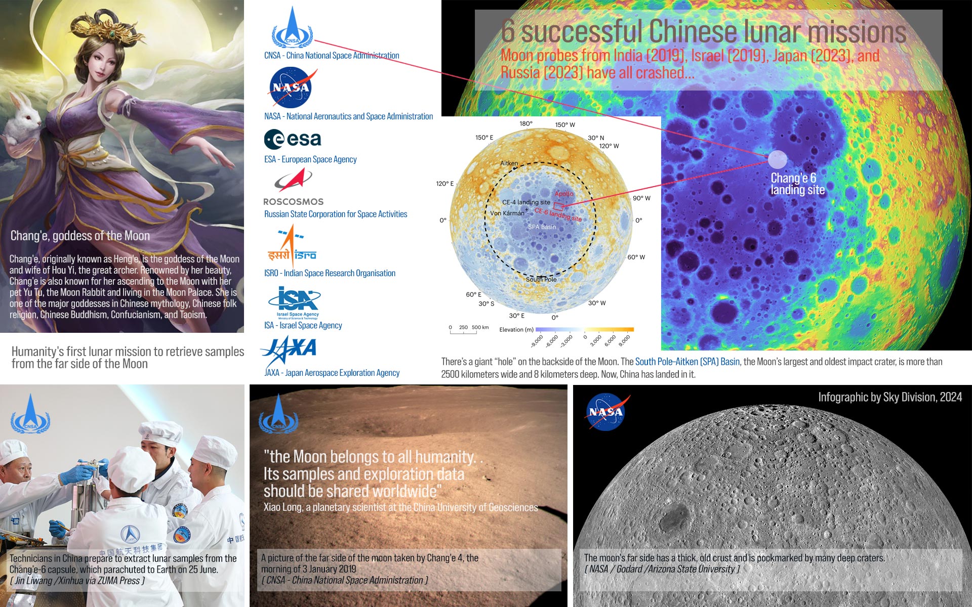 Në Prill 2024, me Chang’e-6 Kina do synonte uljen në kraterin më të madh dhe më të vjetër të Hënës. Poli Jugor i Hënës – Pellgu Aitken (shih grafikën ngjitur, zona blu-vjollcë) është një nga krateret më të mëdhenj në Sistemin Diellor, më shumë se 2500 km i gjerë, dhe 8 km i thellë. Pra sikur ka një “gropë… a fushëgropë” të thellë dhe gjigante në anën e pasme të Hënës, dhe Kina zbret aty me sukses.