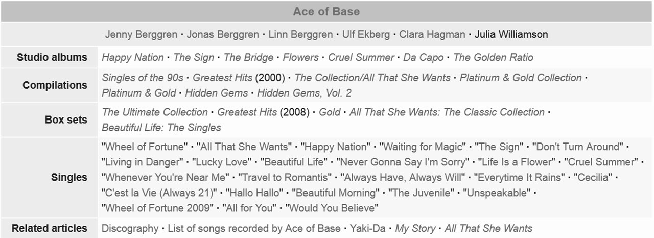 ![]() Ace of Base Swedish pop group from Gothenburg, formed in 1987 under the name Tech Noir. Band members: Jonas Peter "Joker" Berggren : vocals, guitars, keyboards, backing vocals - Malin "Linn" Berggren : former lead vocals, keyboards - Jenny Berggren : former lead vocals - Ulf "Buddha" Ekberg : keyboards, backing vocals - Clara Hagman: former lead vocals.