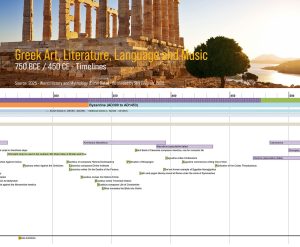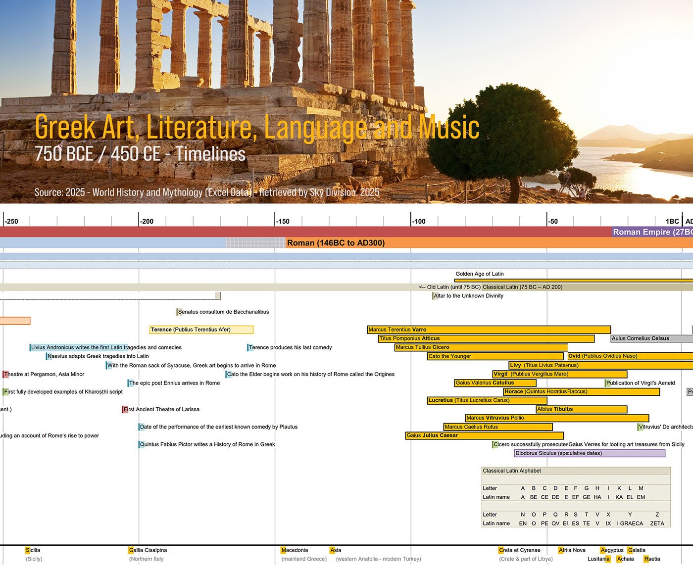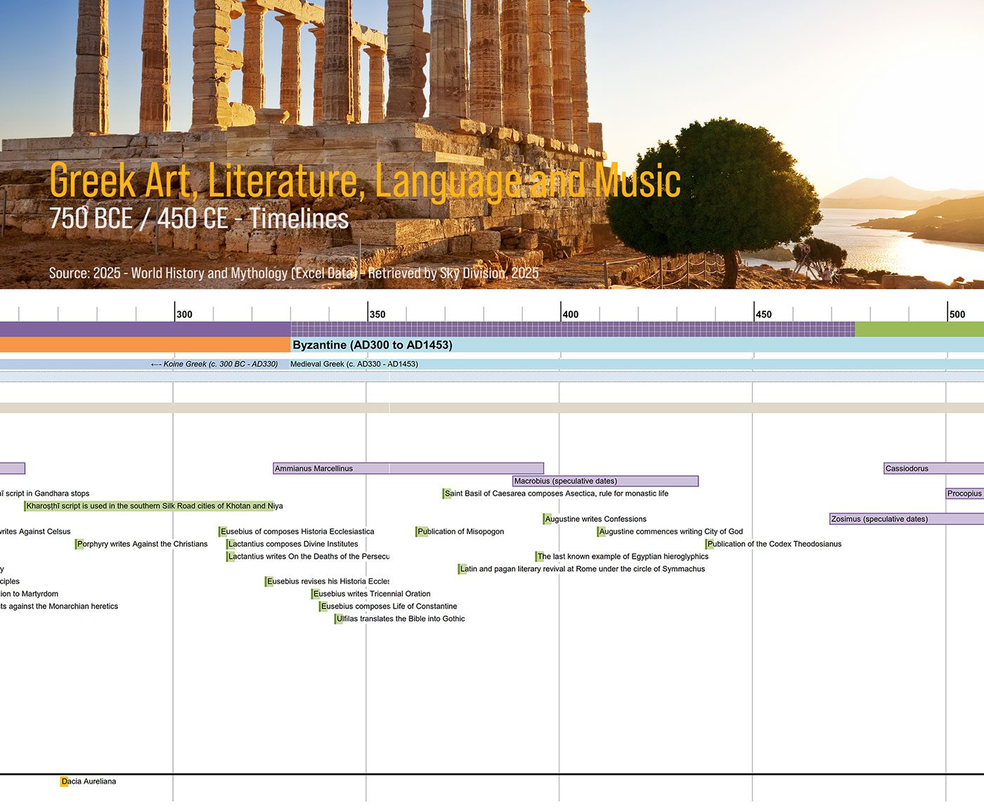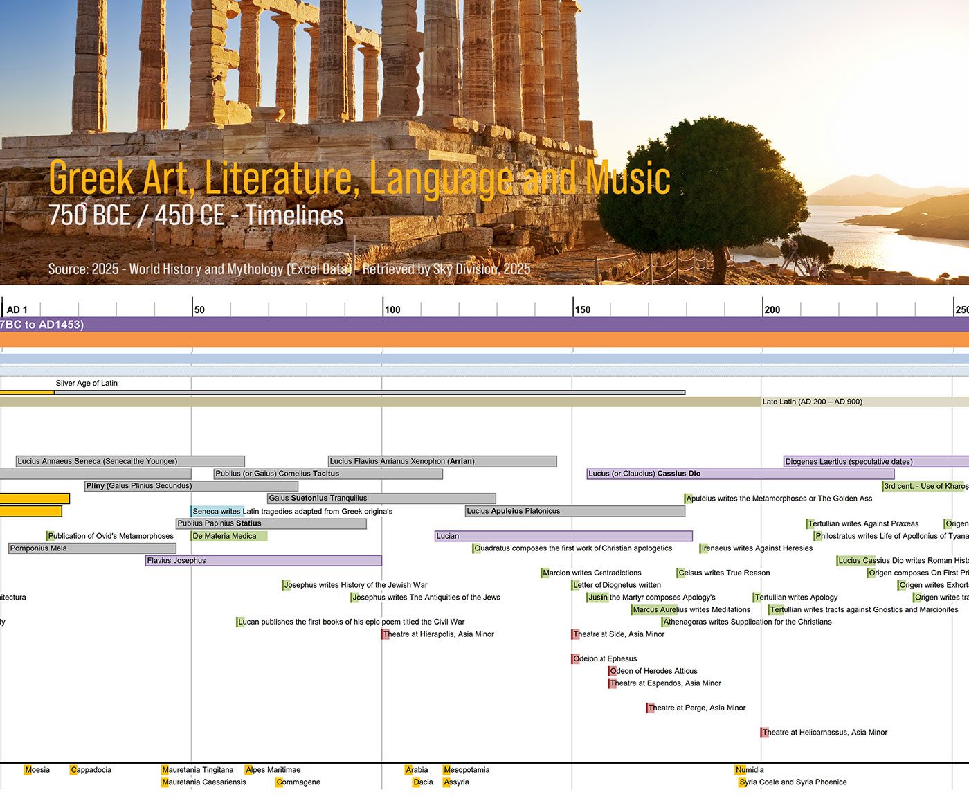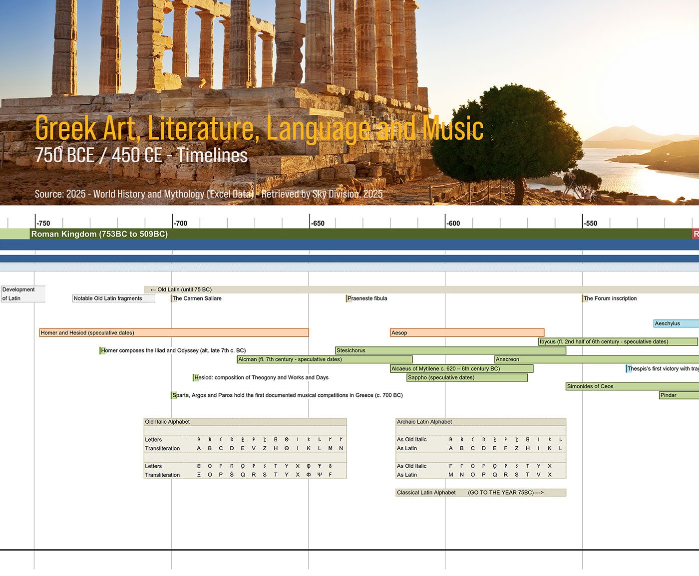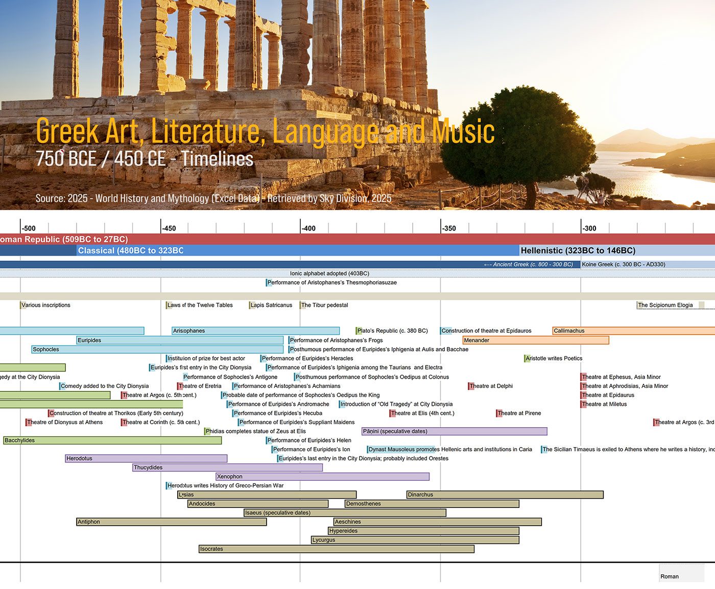 Greek Art, Literature, Language and Music / 750 BCE – 450 CE Greek Art, Literature, Language and Music Timeline / 750 BCE – 450 CE Source: 2025 – World History and Mythology (Excel Data) – Retrieved by Sky Division, 2025