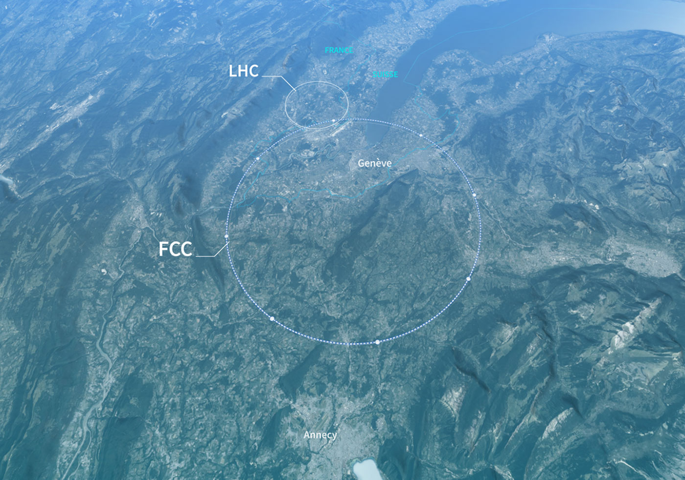 Artistic schematic map showing a possible location for the 90.7 km Future Circular Collider, 180 to 400 m depths for access shafts, 8 surface sites (7 in France, 1 in Switzerland)