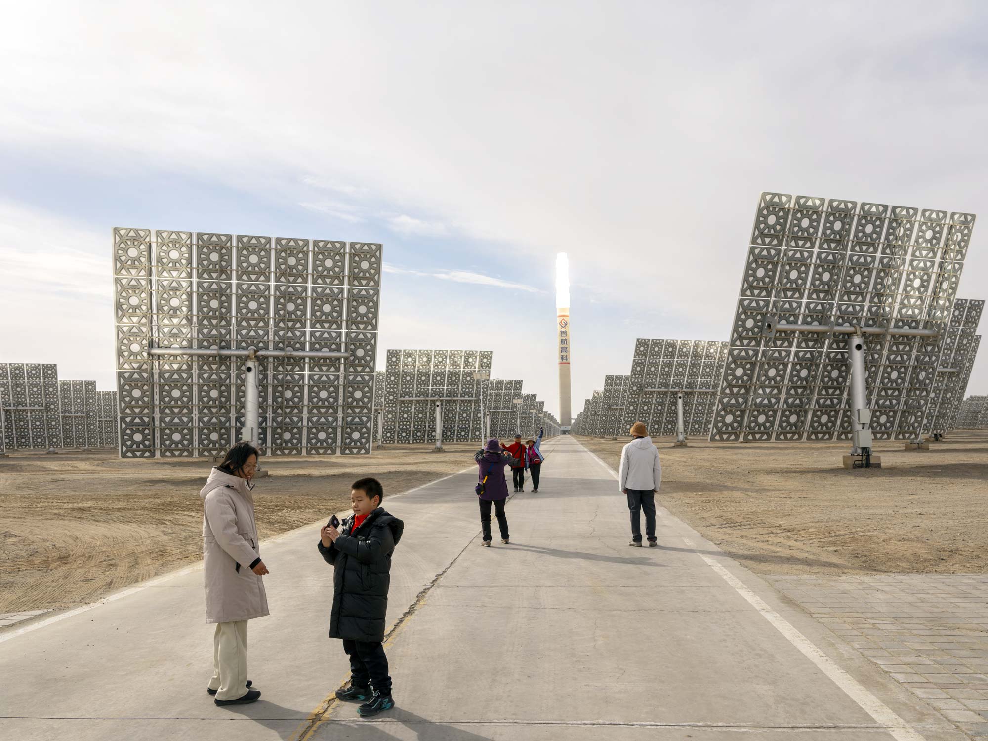 At the focus of the Shouhang Dunhuang plant’s mirrors, a tower set aglow by the concentrated sunshine holds molten salt at 565°C. The salt generates steam that powers a turbine – and because the molten material holds heat through the night, the plant can run nonstop.