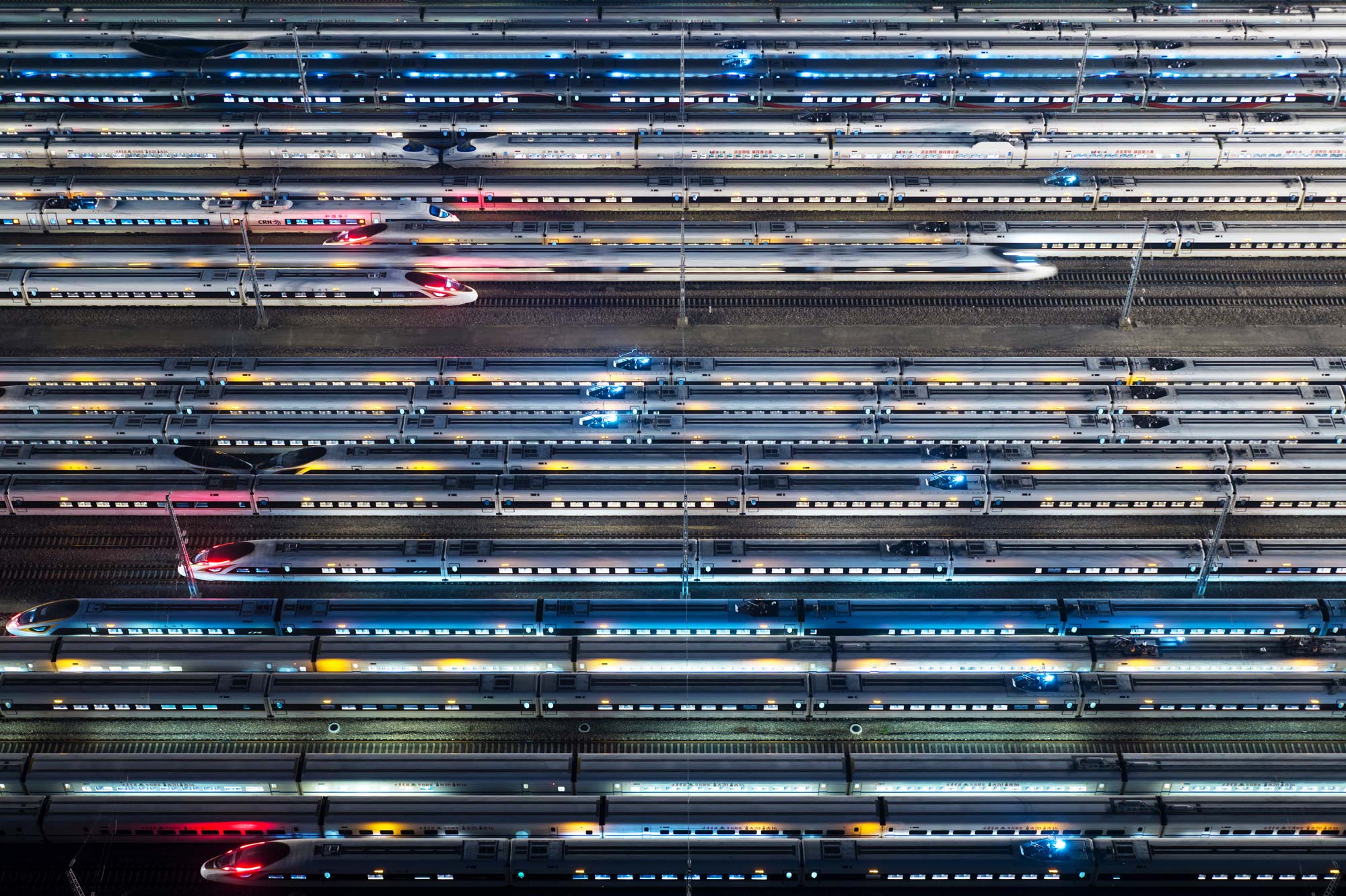 Idling before sunrise in a Nanjing maintenance yard, electric bullet trains wait to be dispatched along the high-speed tracks that span China. At speeds of up to 350 kilometers per hour, the 1300-kilometer journey from Beijing to Shanghai can take just over 4 hours.