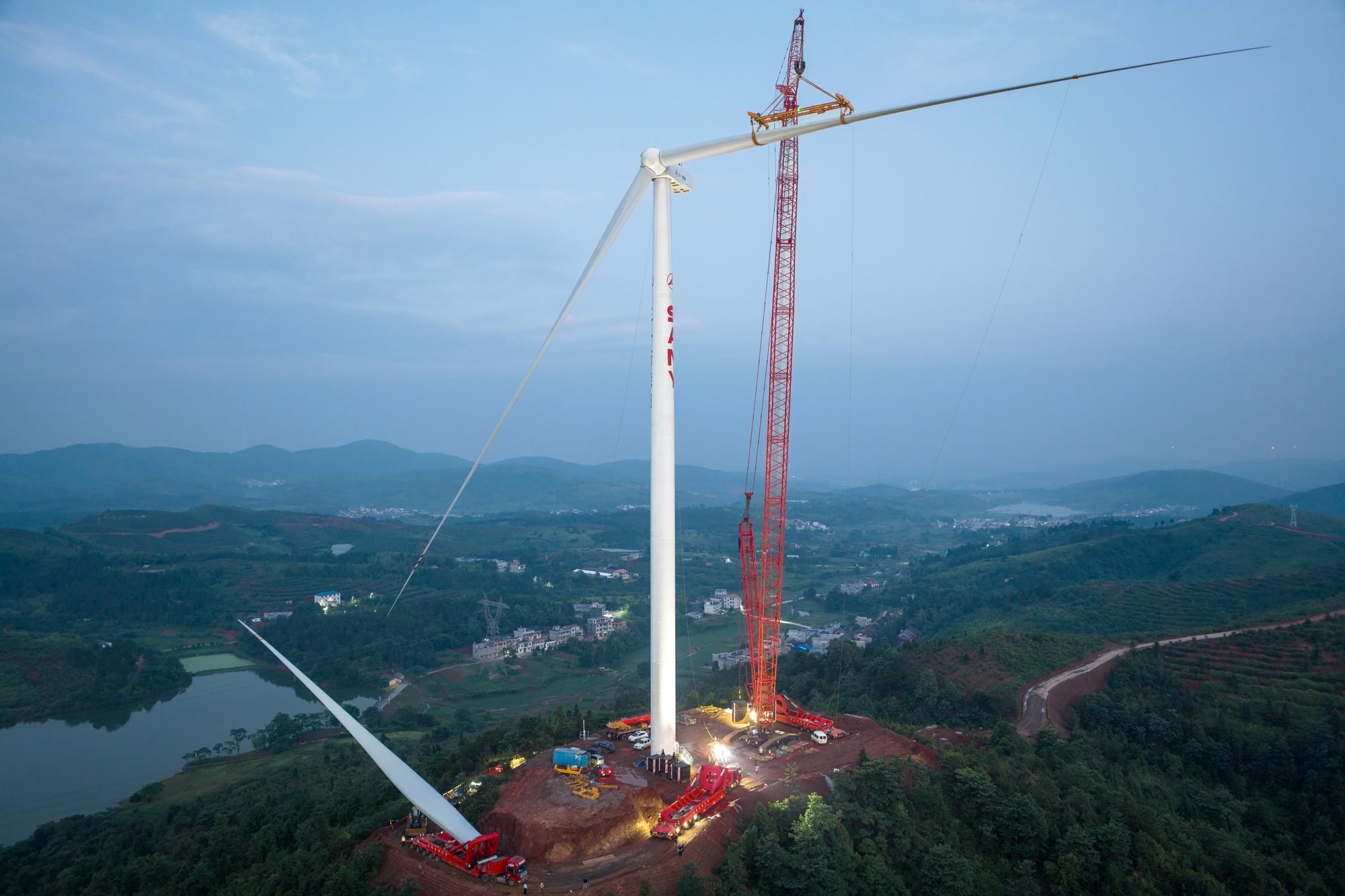 A wind turbine is erected in the hills of Hunan province, part of an 18-tower, 88-megawatt wind farm. China installed roughly 50 gigawatts of new wind power in the first half of this year – amounting to some 10,000 turbines this size.
