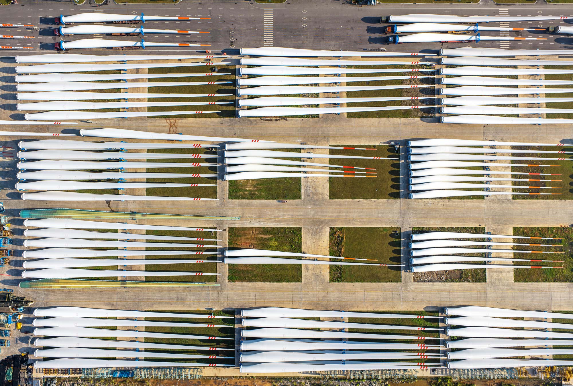 Ready to carve the wind, turbine blades await shipment outside a SANY factory. China produces two-thirds of the world’s wind turbines; most are installed domestically, but international orders are picking up
