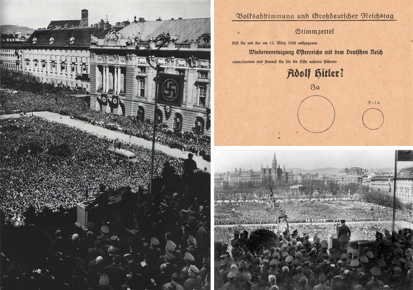 1 – Fletëvotim, 10 Prill 1938 (Pajtoheni me ribashkimin e Austrisë me Rajhun Gjerman, miratuar më 13 Mars 1938, dhe votoni për partinë e udhëheqësit tonë, Adolf Hitler? – Po, Jo)
