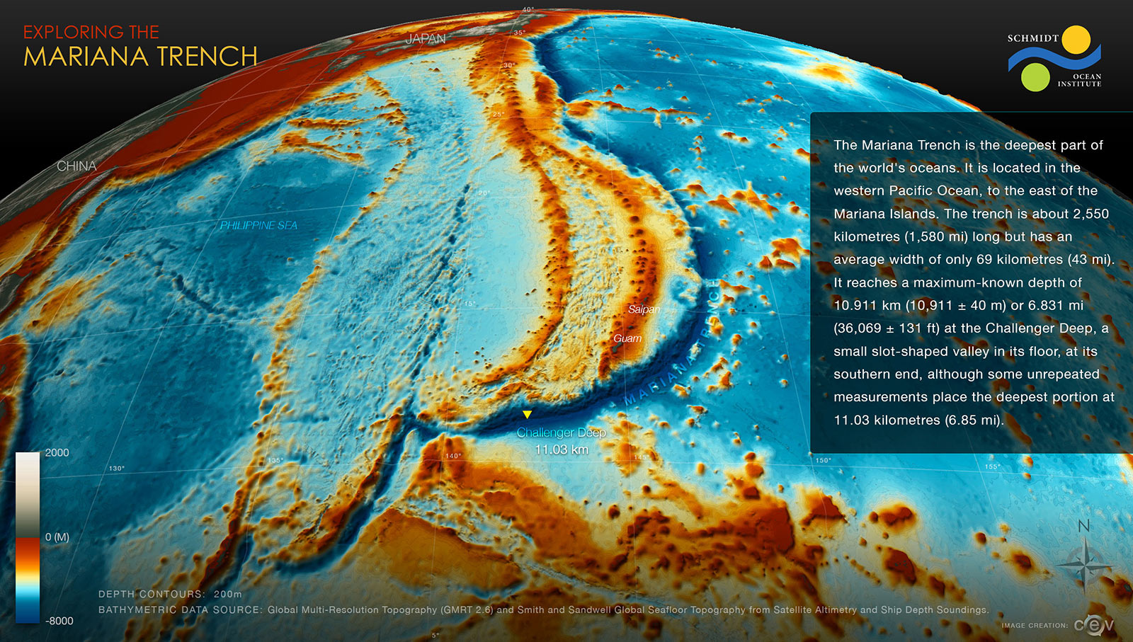 …grafika qenka nga një video, dmth. video-grafikë, slajd i këputur… por who cares : ) qartë e pastër i shpaloska detajet rreth thellësive në Pacifikun Perëndimor – thellësia më e madhe matur ndokund në oqeanet e planetit thuhet se është “Challenger Deep”, që ndodhet në zonën Mariana Trench (një lloj “çarjeje” interesante nënoqeanike), rreth 200 km në lindje të ishujve Mariana të Pacifikut…
