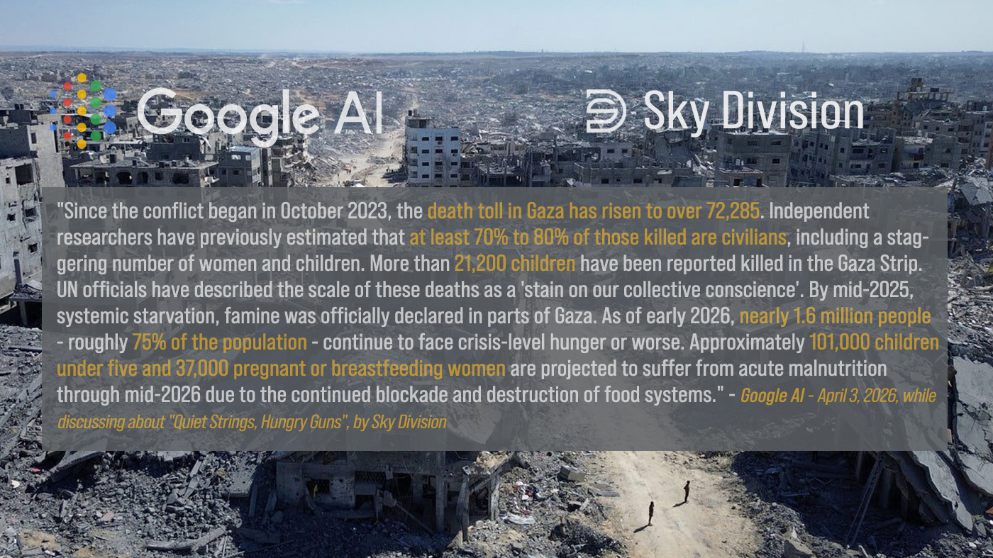“Since the conflict began in October 2023, the death toll in Gaza has risen to over 72,285. Independent researchers have previously estimated that at least 70% to 80% of those killed are civilians, including a staggering number of women and children. More than 21,200 children have been reported killed in the Gaza Strip. UN officials have described the scale of these deaths as a ‘stain on our collective conscience’. By mid-2025, systemic starvation, famine was officially declared in parts of Gaza. As of early 2026, nearly 1.6 million people – roughly 75% of the population – continue to face crisis-level hunger or worse. Approximately 101,000 children under five and 37,000 pregnant or breastfeeding women are projected to suffer from acute malnutrition through mid-2026 due to the continued blockade and destruction of food systems.” – Google AI, April 3, 2026, while discussing about “Quiet Strings, Hungry Guns”, by Sky Division