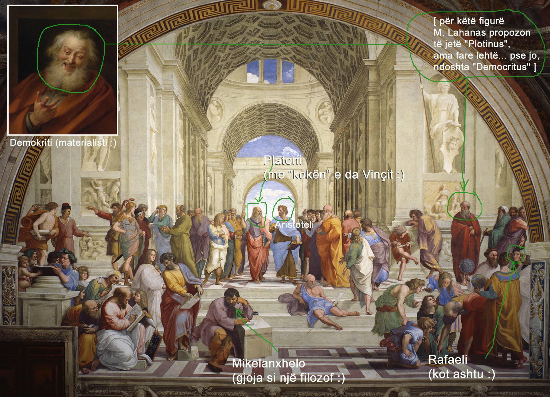 Shih pra, veten po, Mikelanxhelon po… madje dhe Da Vinçin. Asnjëri prej tyre s’ishte “filozof”… gjithë miqtë, por dhe veten e ka futur midis filozofëve : ) Da Vinçi, ose fytyra e tij dmth. i qe “huazuar” pikërisht figurës së Platonit.