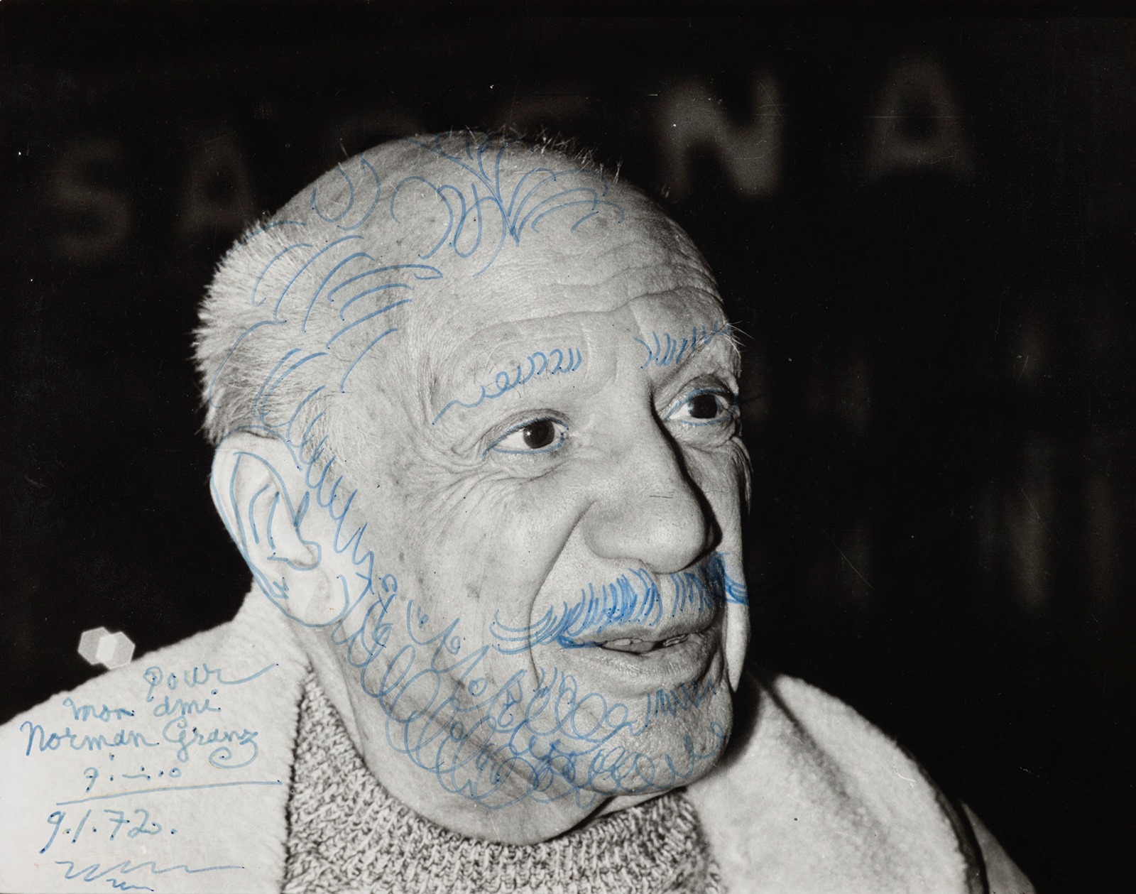 …ky “auto-portret interesant” nga Picasso qe ofruar nĂ« ankandet e Christie’s, dhe e qartĂ« qĂ« artist-xhufurraku thjesht e pati marrĂ« njĂ« foto tĂ« pluhurosur, e pati “shkarravitur” pakĂ«z surratin e vet… duke menduar si “kujtim-kartolinĂ«” pĂ«r mikun, e pati pajisur me datĂ« e me dedikim… “pour mon ami Norman Granz – Picasso 9.1.72“…