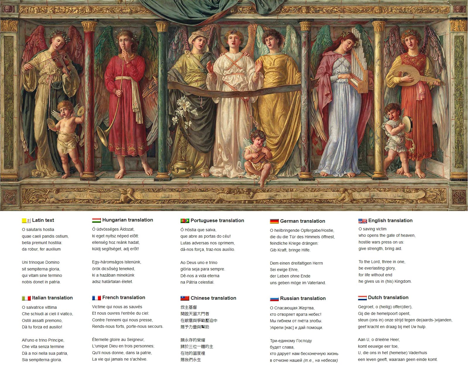 …kur vetë engjëjt ia thonë këngës, njëra engjëllushe paska madje dhe violinë, instrument modern… – buzëqesha teksa po shihja pikturën e George Rhead – “O salutaris hostia” (* O Sakrificë e Shpëtimit) është pjesë e himnit religjioz “Verbum supernum prodiens” shkruar ose kompozuar që në shek. XIII – teksti i latinishtes padyshim do jetë i përshtatur në të gjitha gjuhët por (aty ku i gjeta – dhe i ngjita poshtë pikturës) për fat të keq s’kishte dhe version “shqip”…