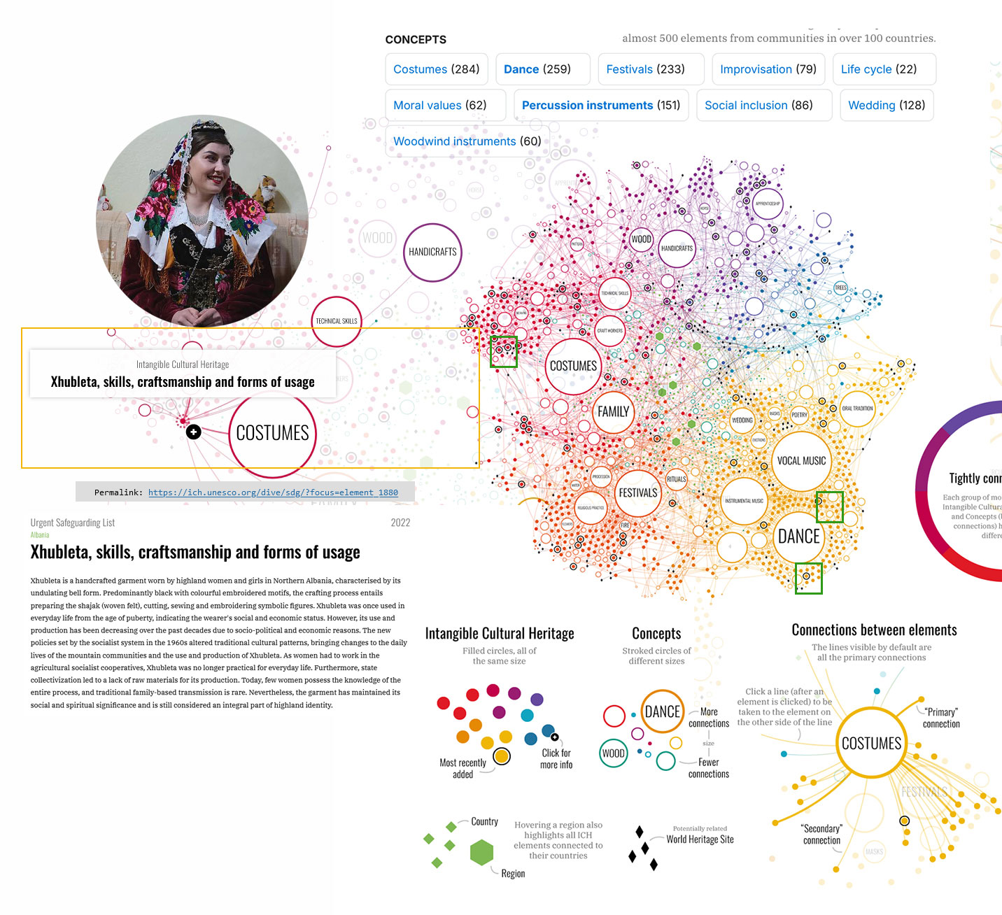 Databaza e UNESCO sot i ka mbi 500 elemente të Trashëgimisë Kulturore Jomateriale, nga mbi 100 vende të botës. Elementet e regjistruara u referohen pothuaj 1000 koncepteve. Tutje krijohen mbi 15.000 ndërlidhje mes këtyre elementeve, koncepteve, shteteve, rajoneve.