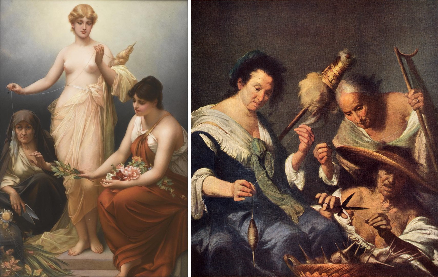 Në pikturën e Louis Scherf shihet Atropa ulur majtas (më e vjetra nga të trija perëndeshat e pavdekshme, mplakja dhe rrudhosja e saj është thjesht diç simbolike : ) në dorën e djathtë i mban një palë gërshërë me të cilat ajo e prenë fillin e Jetës njerëzore. Lakezia duket në të djathtë, ka mbushur prehrin plot lule dhe merret me matjen e fillit të Jetës, ndërsa bukuroshja Kloto gjysmë nudo, me gjokset në fushë, si përfaqësim i freskisë, i bukurisë rinore e madje dhe i virgjërisë, merret me tjerrjen e fillit të Jetës.
