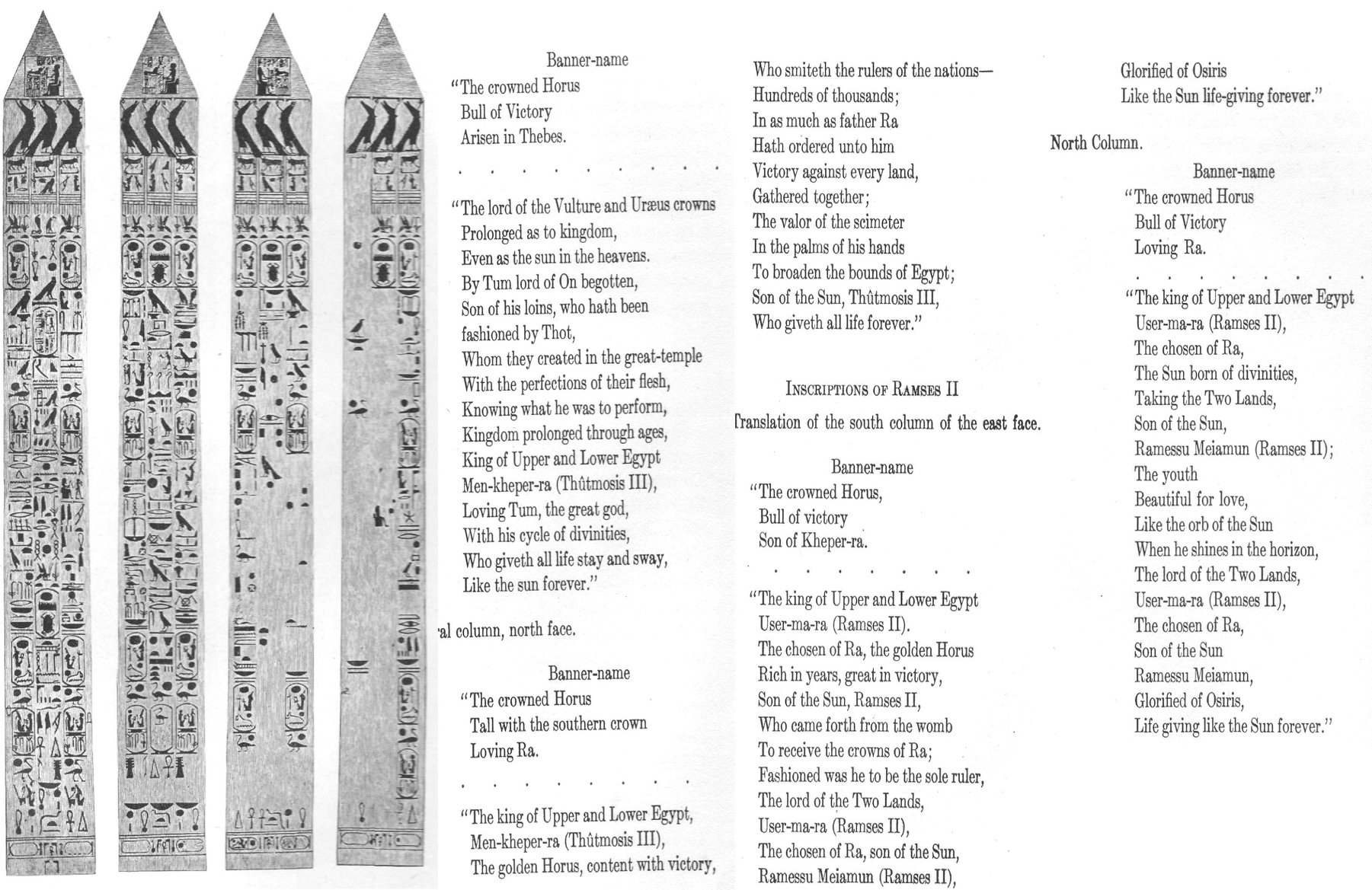 (hieroglifet në monolitin e lartë afro 21 m, me peshë prej 220 t., qenë gdhendur nga faraoni Ramses II, dy shekuj pas konstruktimit nga faraoni Tutmoses III, rreth v. 1450 p.e.s. në Heliopolis)