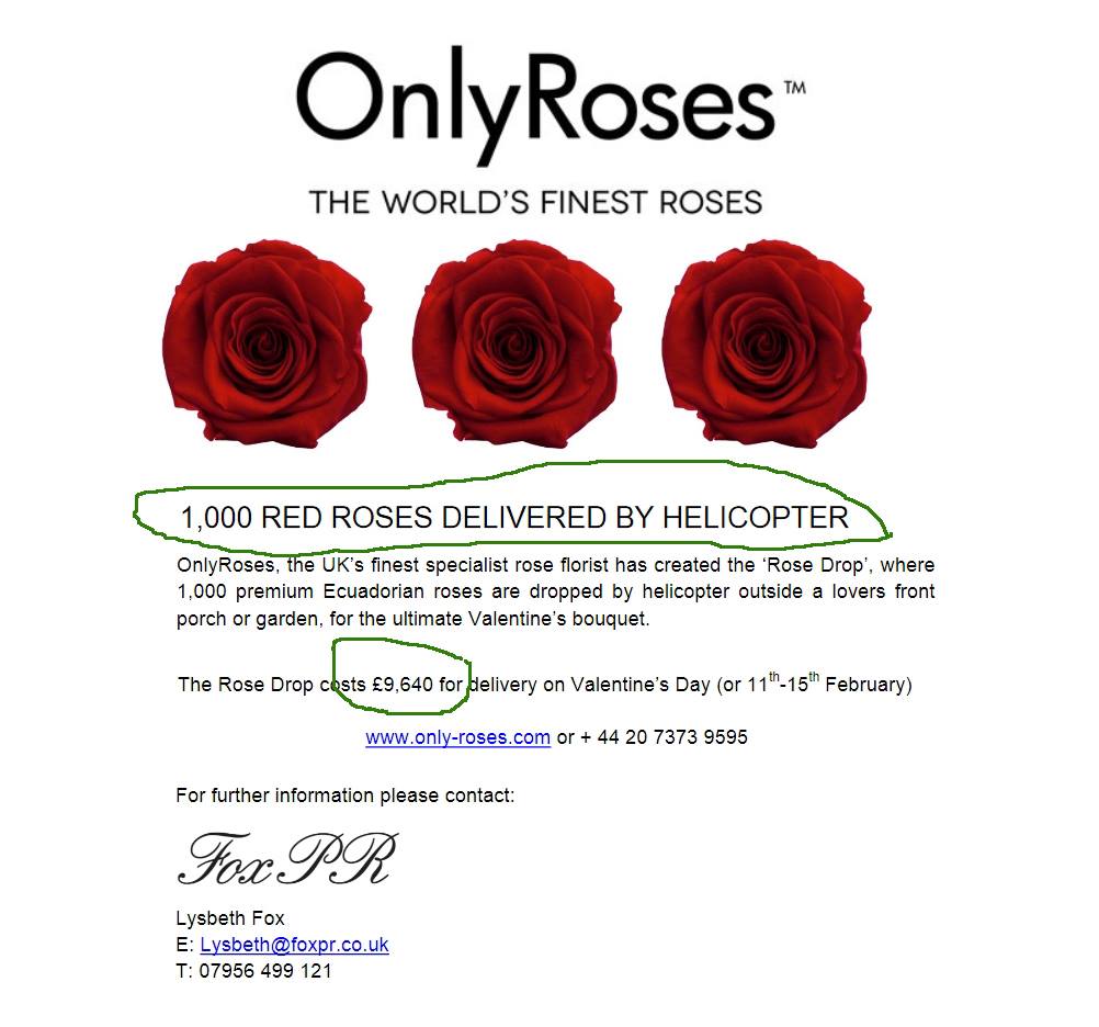 …pata shkruar se si Gunter Sachs ia pati nisur një helikopter me trëndafila bukuroshes franceze Brigitte Bardot – mirëpo tani nuk qenka ndonjë luks i madh, 10.000 kushtuaka, sot e gjeta se një dikush andej përtej La Manshit ofruaka pikërisht këtë shërbim : )