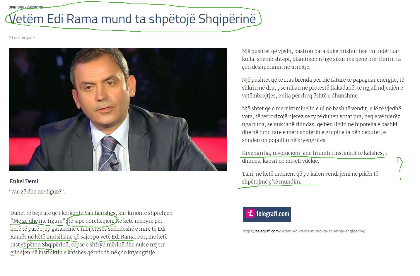 “…me dorëheqje Edi Rama i jep garancinë e mbijetesës Shqipërisë dhe vetë Edi Ramës, në këtë mutsihane që sajoi po vetë Edi Rama” – konkludonte dikush me emrin Enkel Demi në rubrikën “Opinion” të “Telegrafi”, 6 ose 7 Q 2019