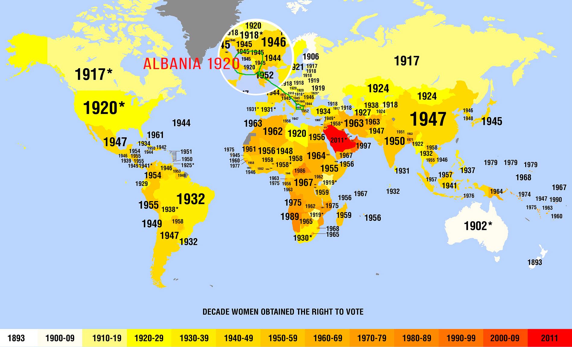 …ngjitur harta e botës me vitet kur gratë kanë fituar të drejtën për votim, dihet që Shqipëria ishte bukur e hershme në këtë drejtim, gratë shqiptare që në v.1920 mund të votonin, njësoj krenare si dhe gratë amerikane, të njëjtin vit si dhe ShBA (1920), 1 vit a 2 pas Britanisë (1918), Holandës (1919), Gjermanisë (1918) etj. por ama me dekada përpara Francës (1944), Italisë (1945), Greqisë (1952)… madje Zvicra tek në v. 1971 ua pati lejuar grave të votojnë, shih pra, ec e mos u mahnit, Shqipëria s’e kishte mbushur ende as 1 dekadë si shtet, zviceranët krekoseshin se ishin 700 vjet shtet, konfederatë, ndërsa nga ana tjetër aq të “prapangelur” kur janë në pyetje gratë : )