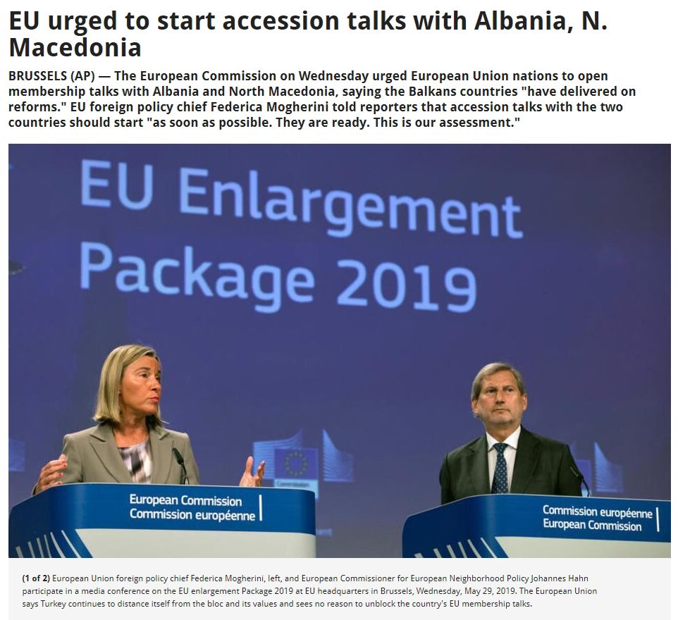 [ Burimi: Associated Press ] – Komisioni Europian sot u paska kërkuar vendeve të BE që t’i nisin bisedimet me Shqipërinë dhe me Maqedoninë e Veriut për anëtarësimin në BE, duke thënë se vendet e Ballkanit “i kanë kryer reformat që duhej kryer”. Shefja e politikës së jashtme të BE, Federica Mogherini u paska thënë gazetarëve se bisedimet e pranimit me dy vendet duhet t’fillojnë “sa më shpejt që t’jetë e mundur, ato janë gati (dhe dmth. të gatshme për anëtarësim), ky është vlerësimi ynë”.